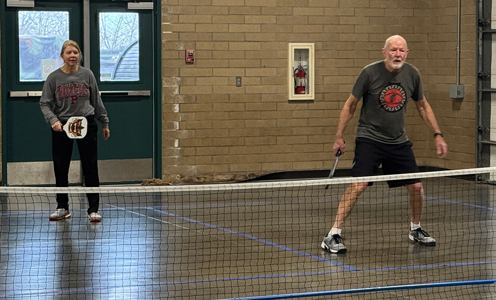 President Andrea Stewart and Rus Peters prepare to receive during the club’s second annual “Build Better Friendships” Pickleball Tournament at the Forest Grove National Guard Armory. Photo by Blake Timm.