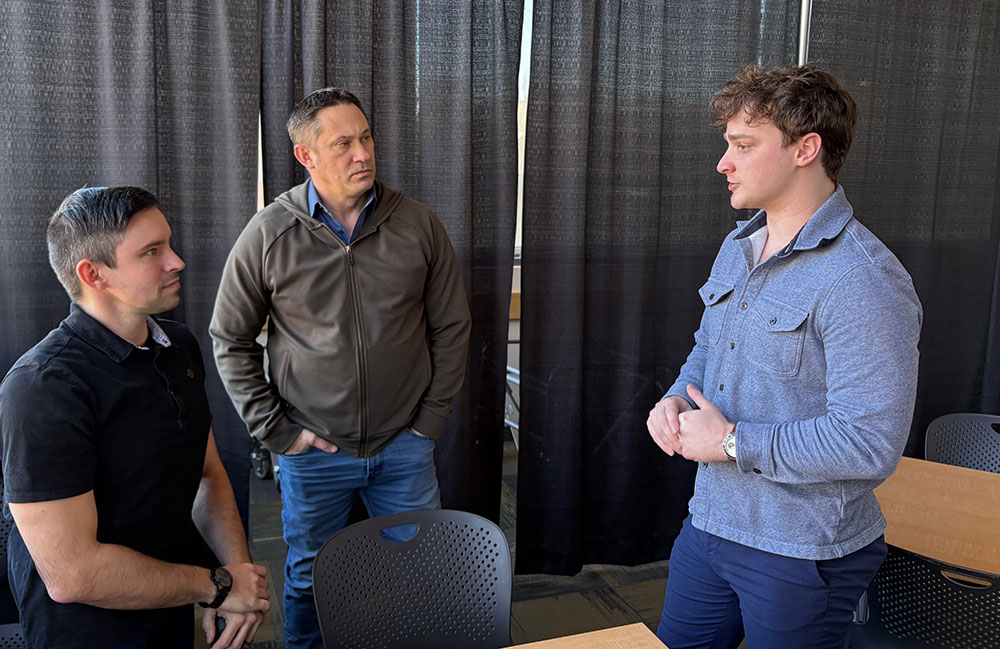 Tanner Hoskins (left) and Kelly Stolp (center) of the Pacific Northwest Missing Persons Project visit with club Program Chair Javin Frelin at our Feb. 11 club meeting. Photo by John Schrag.