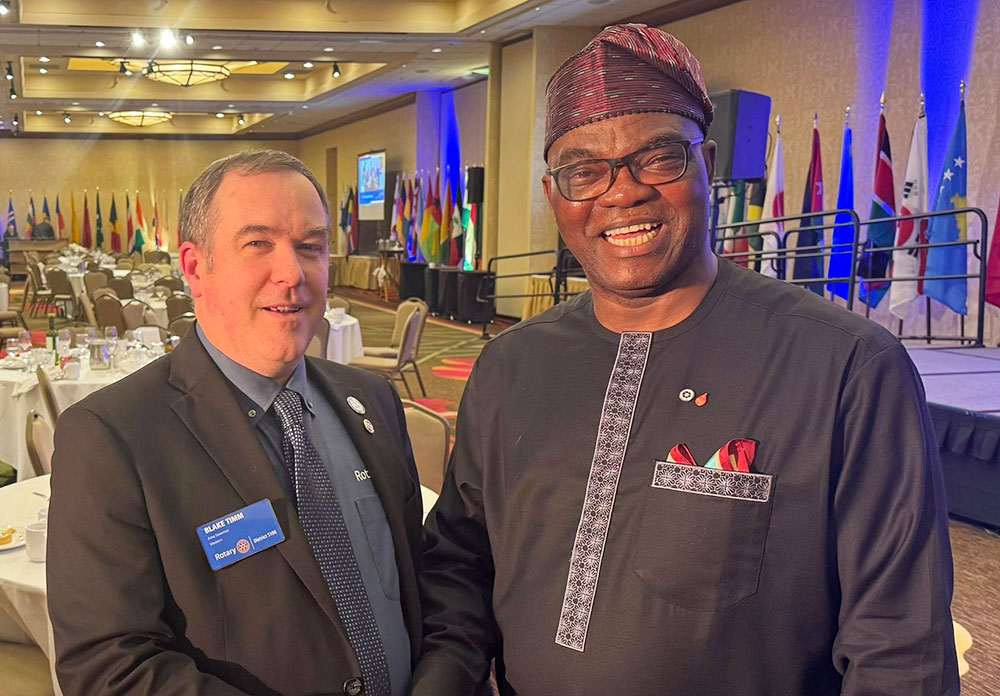 Club member and District 5100 Area Governor Blake Timm with 2026-27 Rotary International President Olatinka Babalola at the Pacific Northwest Presidents-Elect Learning Seminar in Seatac, Washington, on Feb. 21, 2026. Babalola was the featured speaker at the three-day event that prepares club leadership for the 2026-27 Rotary year. Photo by Jim Boyle.